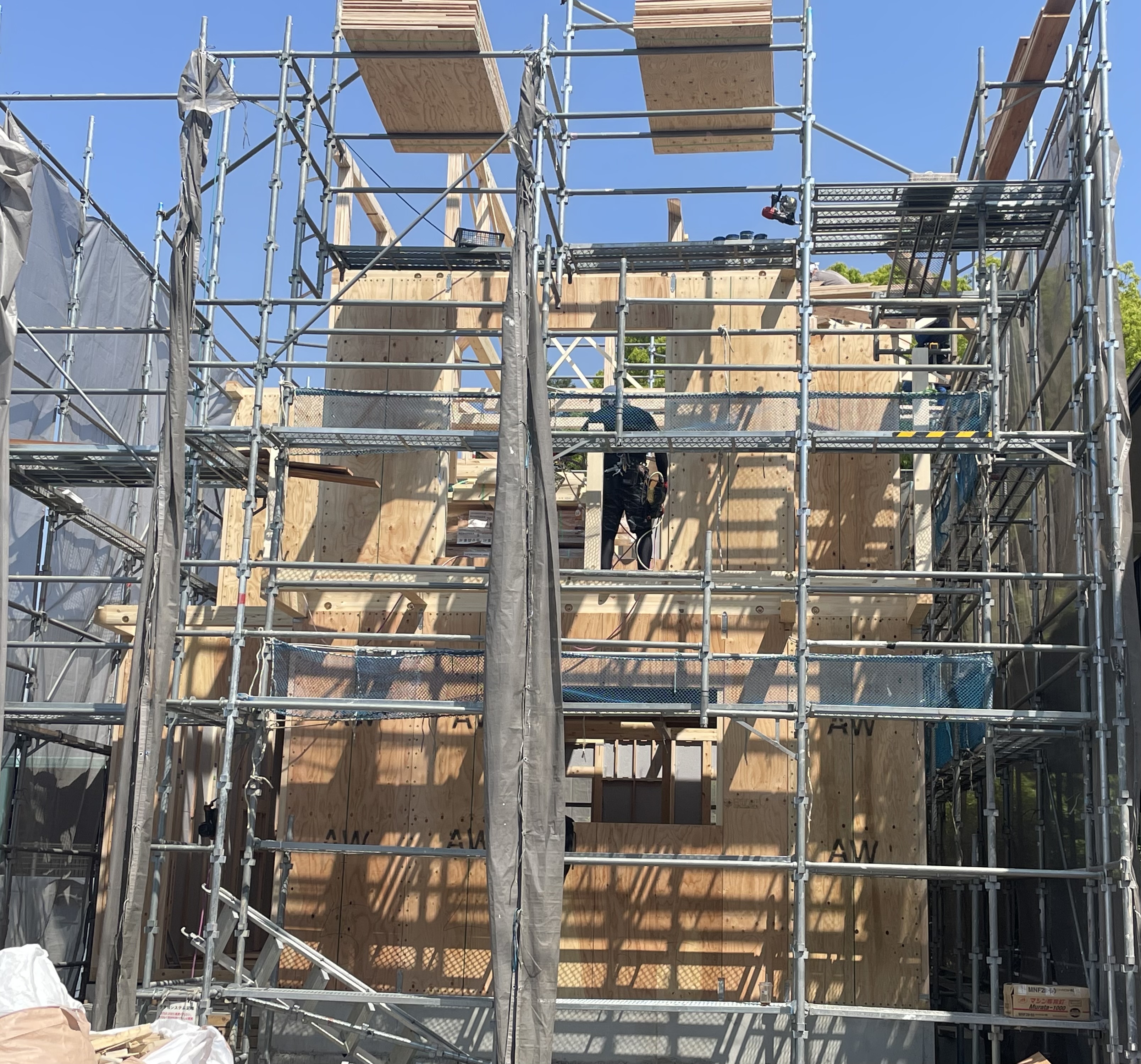 #岡崎市#上棟#ええ天気最高の青空のもと、上棟です☀️羽柄、金物付け、面材貼りまで施工いたしました!完。この空が青さがより一層、躯体部分を映えさせてくれてますねǶ